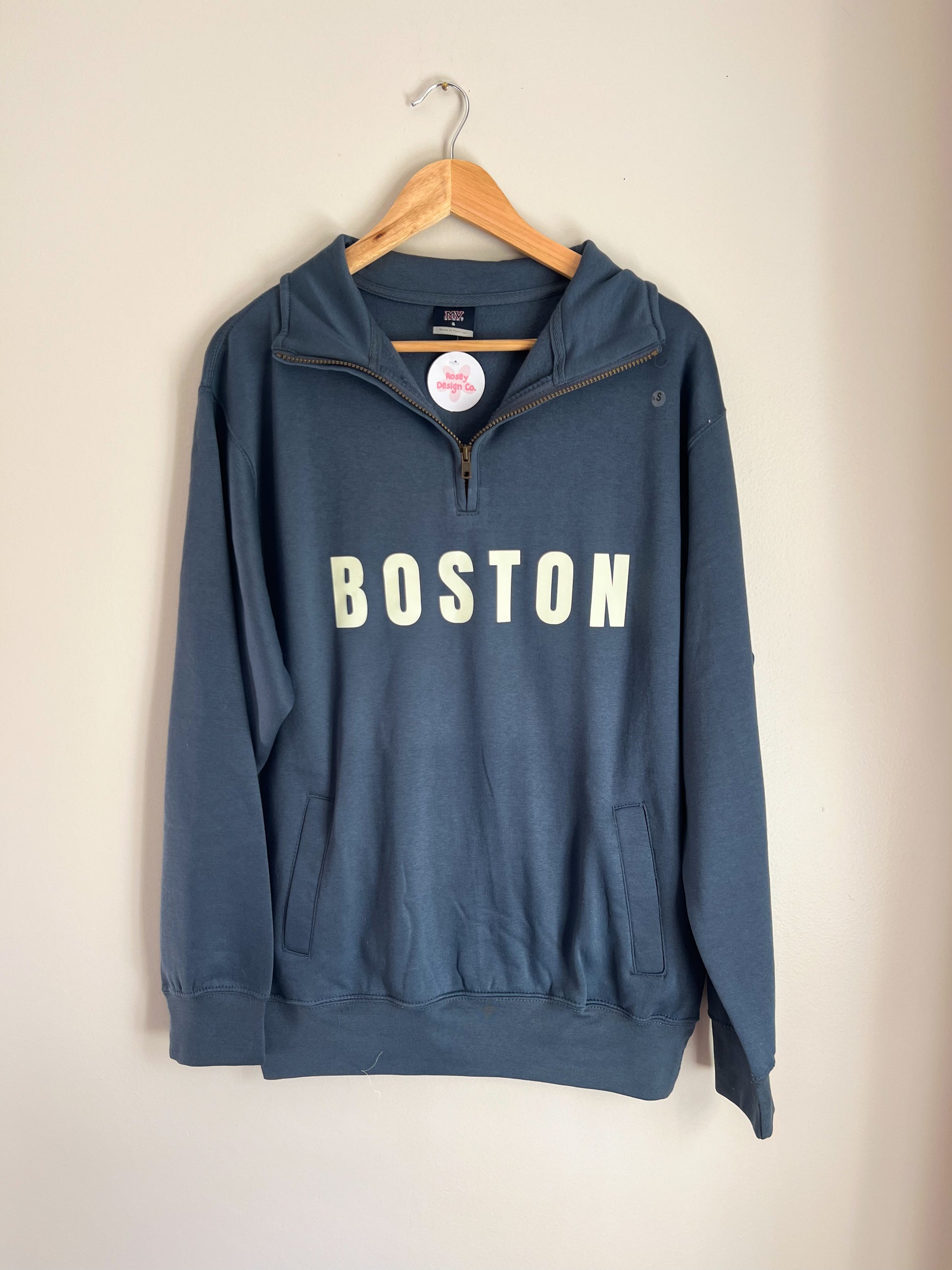 Stay cozy and spirited in this Boston Quarter Zip, decked out in denim blue with "Boston" across the front. Perfect for chilly days, its soft fleece keeps you warm while adding a fun, city-loving vibe to your casual wardrobe. Whether you're hitting the streets or lounging at home, this quarter zip brings playful flair to your everyday comfort.