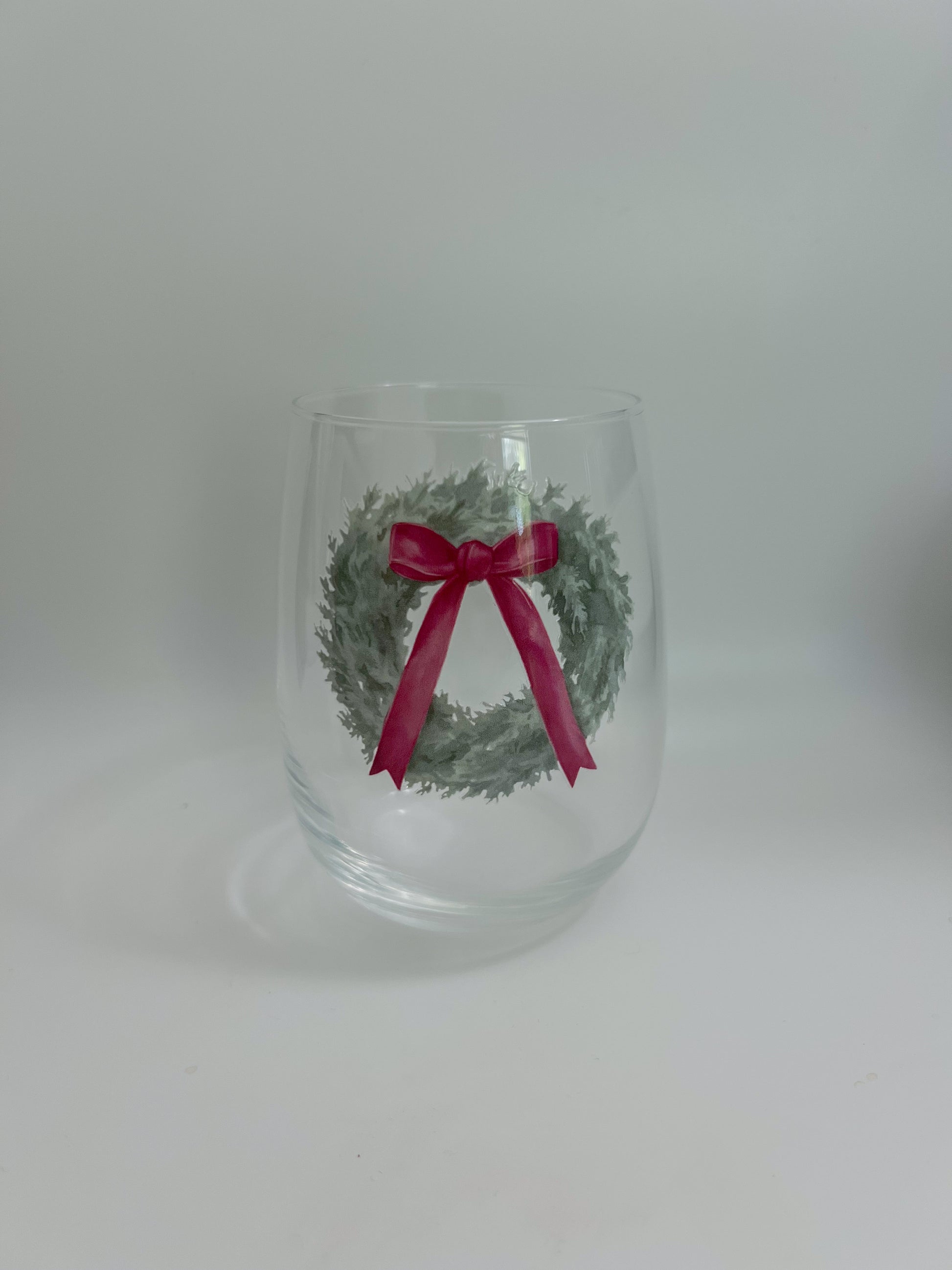 Enjoy your favorite holiday sips in style with this playful stemless wine glass featuring a festive Christmas wreath design. Perfect for adding a cheerful touch to your celebrations.